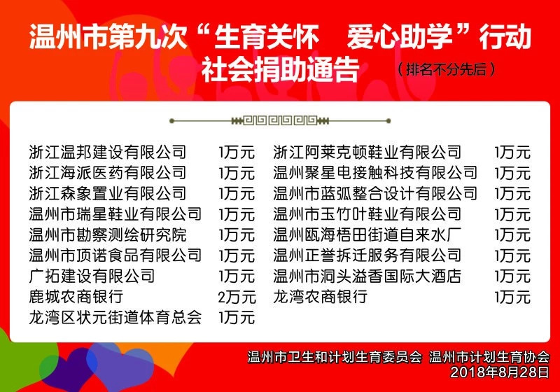 活動(dòng)現(xiàn)場(chǎng),主辦方向浙江海派醫(yī)藥有限公司等11家捐助企業(yè)獻(xiàn)上愛(ài)心企業(yè)牌子,并表示了對(duì)助學(xué)活動(dòng)支持的感謝之意;6名女高中新生和23名女大學(xué)生新生,在開(kāi)學(xué)即將來(lái)臨之際,每人拿到2000元和4000元助學(xué)金。此外,浙江省馬寅初人口福利基金會(huì)向溫州第九次“生育關(guān)懷 愛(ài)心助學(xué)”活動(dòng)捐贈(zèng)助學(xué)金44.3萬(wàn)元。