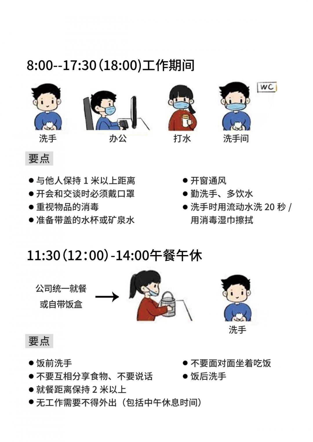 員工不得外出就餐,公司采用分時段分餐制,保持一米以上距離,倡導(dǎo)自帶餐具,避免集中用餐發(fā)生交叉感染。